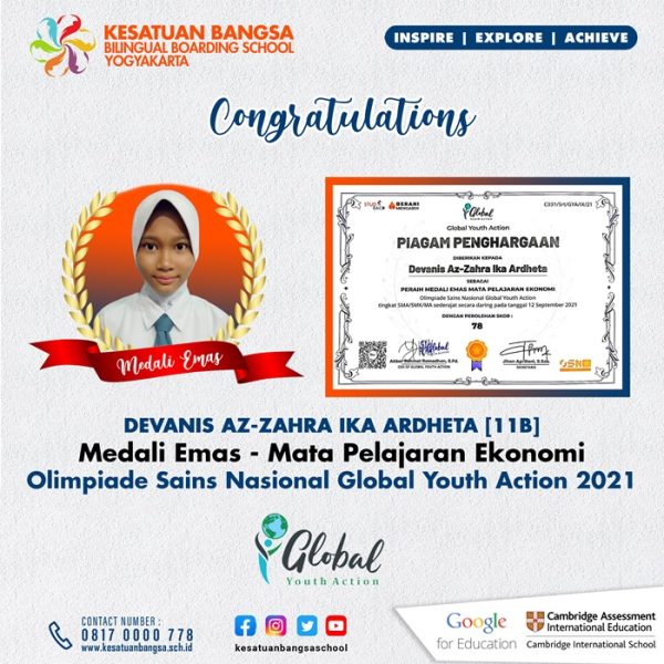 Selamat untuk ananda Devanis Az-Zahra Ika Ardheta siswa kelas 11 SMA Kesatuan Bangsa yang telah meraih medali emas pada bidang Mata Pelajaran Ekonomi Olimpiade Sains Nasional Global Youth Action yang diselenggarakan